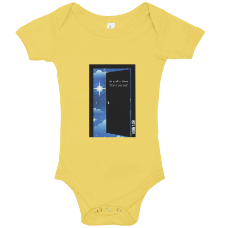 Wrap your little one in with this charming "Come & See" baby onesie! Featuring a sweet little design of a starry night and open door. Made from soft, breathable cotton in a vibrant sky blue, it’s perfect for playtime, naptime, or cuddles. With easy-snap closures for quick changes, it’s as practical as it is heartwarming. A perfect gift for baby showers, birthdays, or everyday wear.