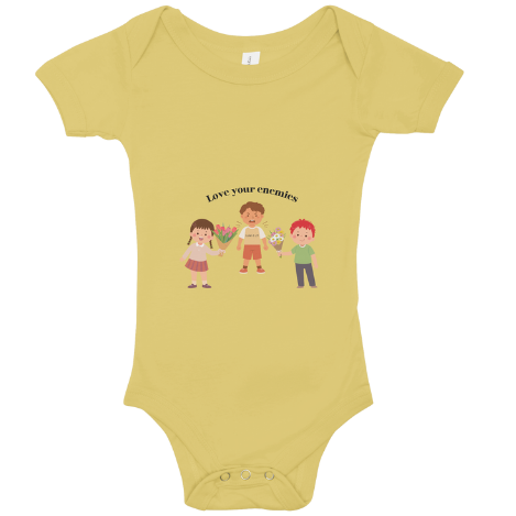 Wrap your little one in with this charming "Love Your Enemies" baby onesie! Featuring friends holding flowers. Made from soft, breathable cotton in a vibrant sky blue, it’s perfect for playtime, naptime, or cuddles. With easy-snap closures for quick changes, it’s as practical as it is heartwarming. A perfect gift for baby showers, birthdays, or everyday wear.